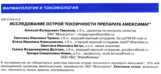 Ключевые слова: амоксициллин, токсичность, мыши, орально, внутримышечно, Амоксимаг®.